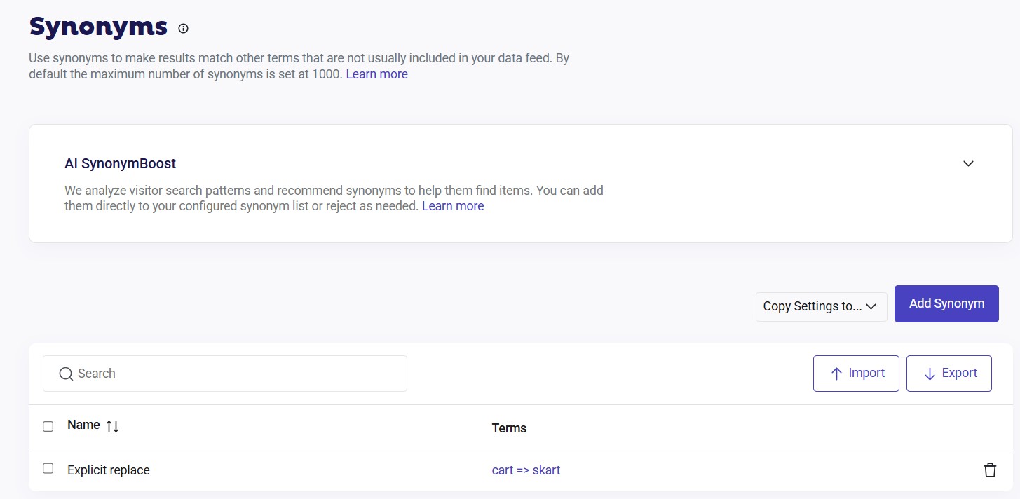 Mit Synonymen in DooFinder kannst du deine Suchergebnisse gezielt verbessern. Du kannst Begriffe miteinander verknüpfen, damit auch Suchanfragen zu Ergebnissen führen, die in deinem Datenfeed eigentlich nicht direkt zusammengehören. Im DooFinder-Admin-Panel legst du einfach deine gewünschten Synonyme fest und bestimmst, welche Begriffe bei der Suche miteinander abgeglichen werden sollen. So stellst du sicher, dass deine Kunden immer die passenden Produkte finden – auch wenn sie andere Begriffe verwenden.